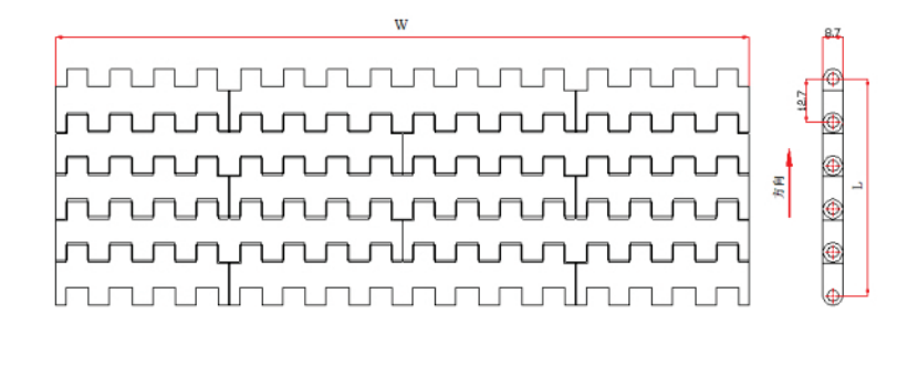 2.材質(zhì):網(wǎng)帶材質(zhì):聚甲醛(POM);銷軸材質(zhì):聚丙烯(PP);聚甲醛(POM)。